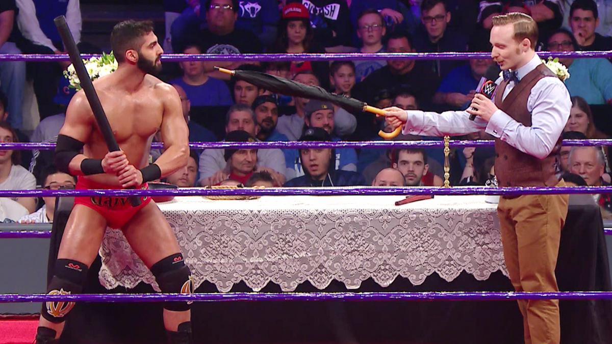 Gallagher starts the duel, but Daivari wants to jump him immediately. Gallagher catches this and quickly takes him out with the umbrella. Daivari uses the table to attack Gallagher, but Gallagher makes a comeback and drives Daivari out of the ring with a running dropkick.