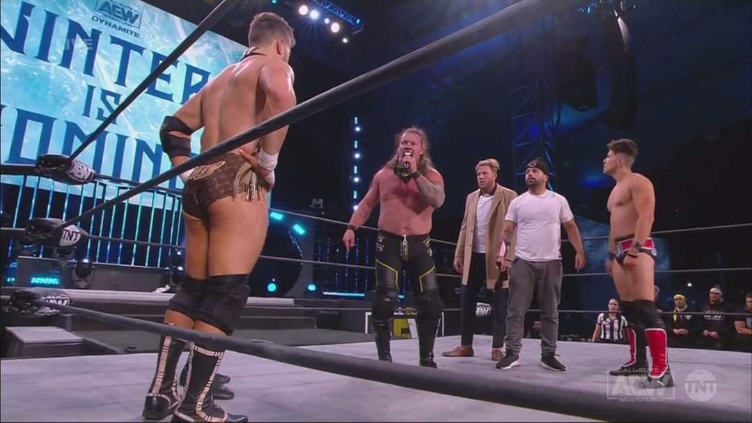 During his match with Kazarian, Jericho was placed in a Boston crab. MJF ran out and threatened to throw in the towel on Jericho’s behalf. Sammy Guevara ran out and took the towel away from MJF.