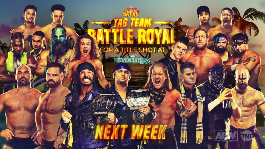 Other participants announced for the battle royal include Top Flight, Private Party, Jurassic Express (Jungle Boy & Luchasaurus), FTR, Chris Jericho & MJF, The Acclaimed, Sammy Guevara & Jake Hager, Santana & Ortiz, and Stu Grayson & Evil Uno of The Dark Order.