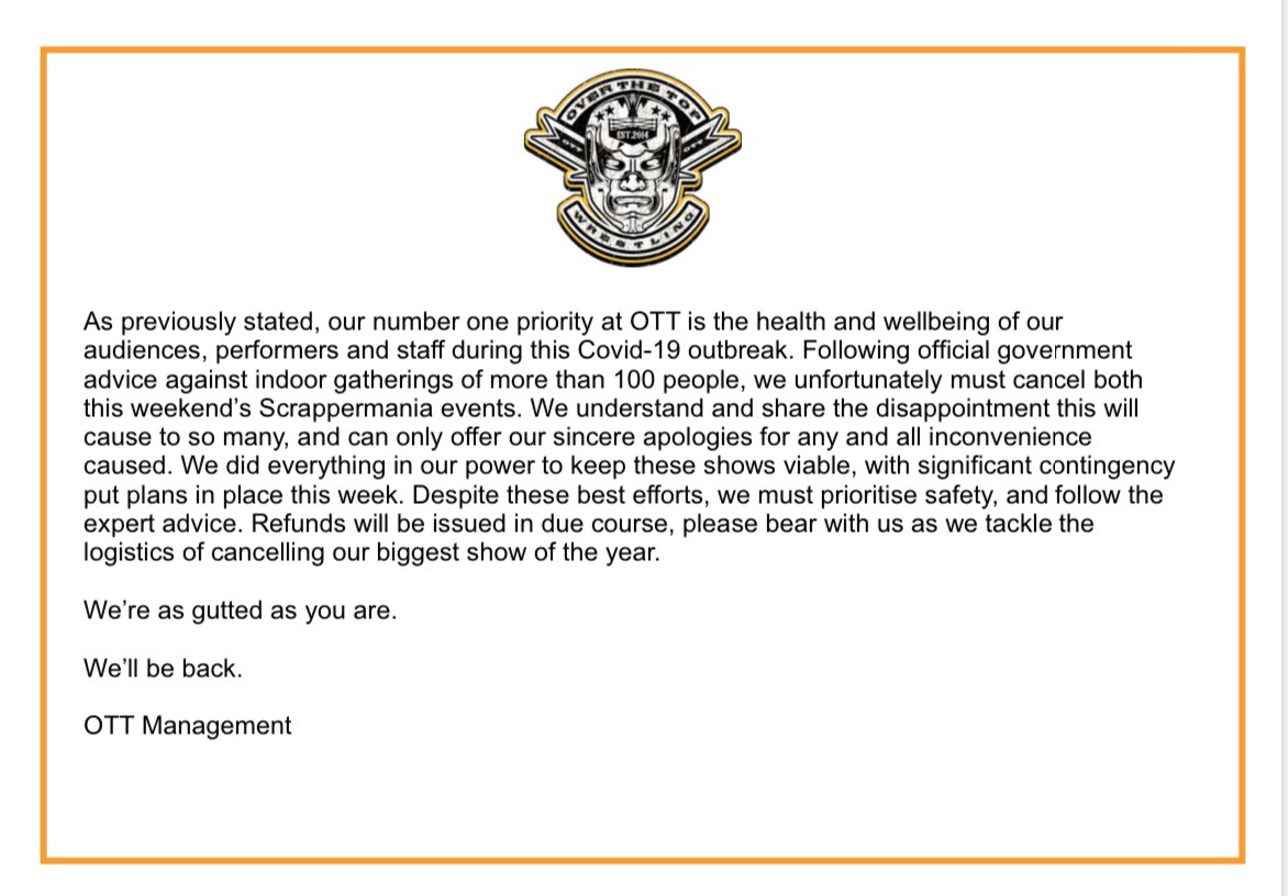 OTT cancels ScrapperMania 6 events amid coronavirus outbreak