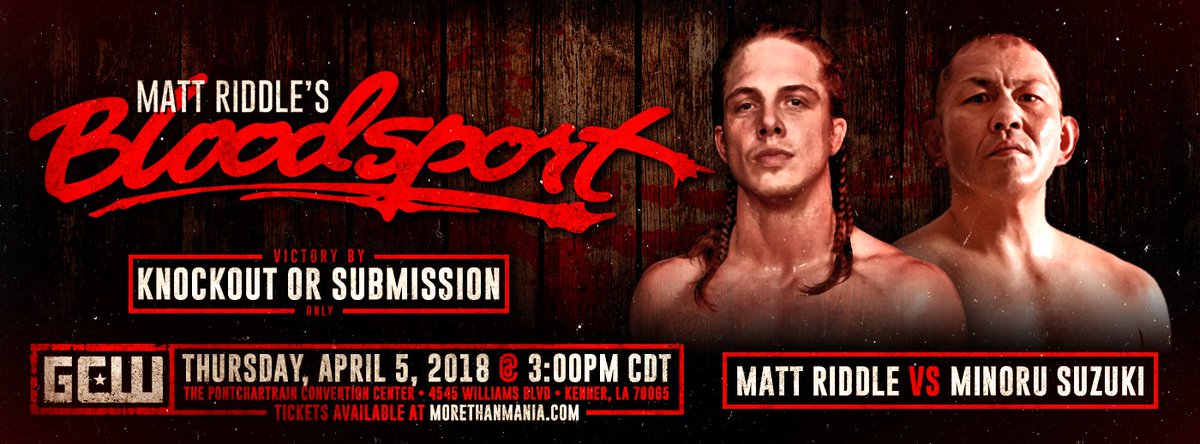 The theme for Matt Riddle’s Bloodsport, which is being presented by Game Changer Wrestling, is that wrestlers can only win by knockout or submission. It’s taking place at the Pontchartrain Center in Kenner, Louisiana at 4 p.m. Eastern time and will air live through WWN Live and Fite TV.