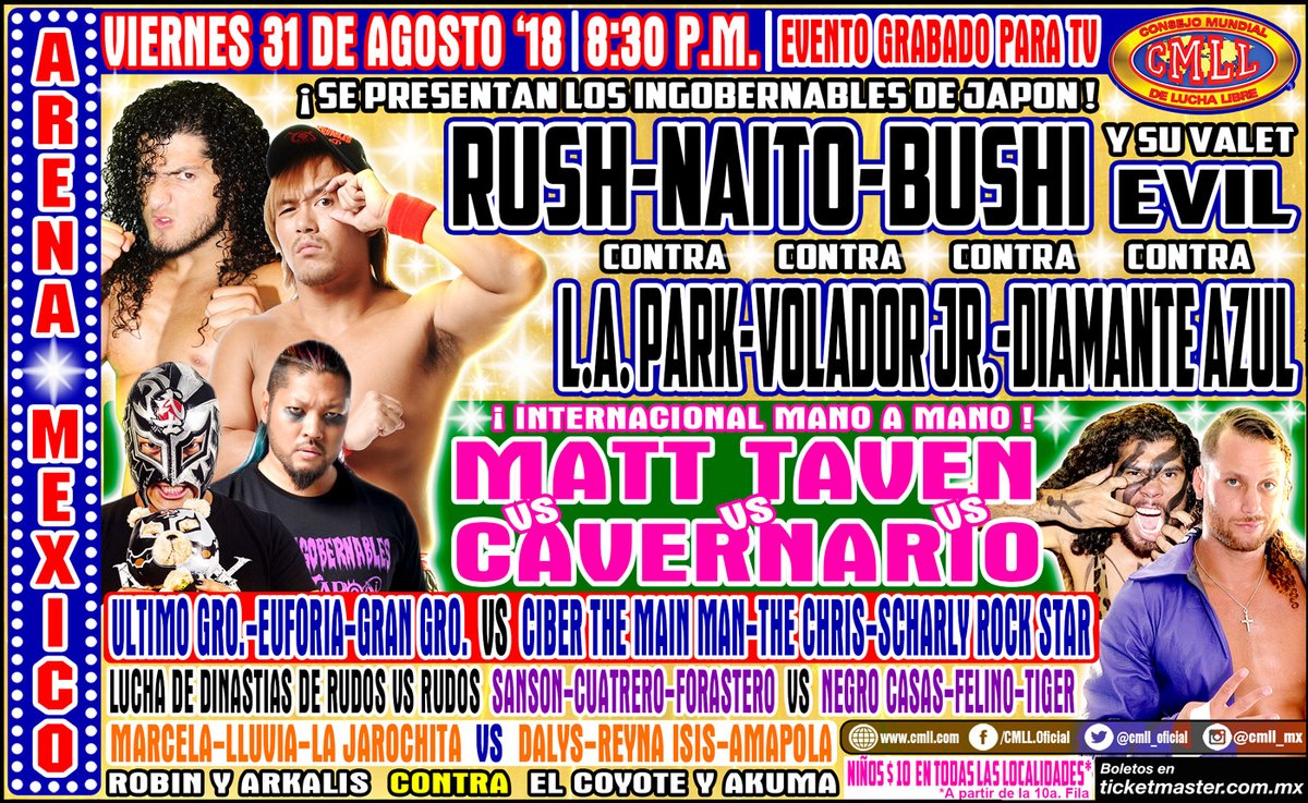 The co-main event of the 8/31 card will have a singles match between two of the participants in the 85th Aniversario main event, as Matt Taven will take on Barbaro Cavernario. Ultimo Guerrero, Euforia and Gran Guerrero will also team up to take on Ciber the Main Man, The Chris and Scharly Rock Star.