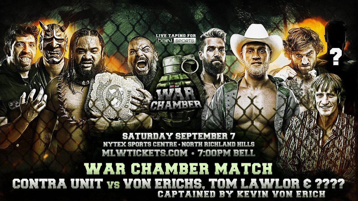 The War Chamber match will be four-on-four. One partner for Lawlor, Marshall & Ross has yet to be officially revealed, though it appears to be Low Ki based on MLW’s last set of tapings. They’ll be facing Contra’s Jacob Fatu, Josef Samael, Simon Gotch & Ikuro Kwon.