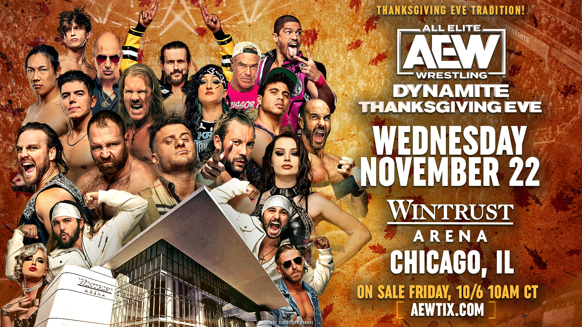 The Thanksgiving Eve Tradition continues when #AEW returns to the @WintrustArena in Downtown Chicago for #AEWDynamite LIVE on Wednesday, November 22nd! Tickets will go on sale Friday, October 6th at 10am CT.