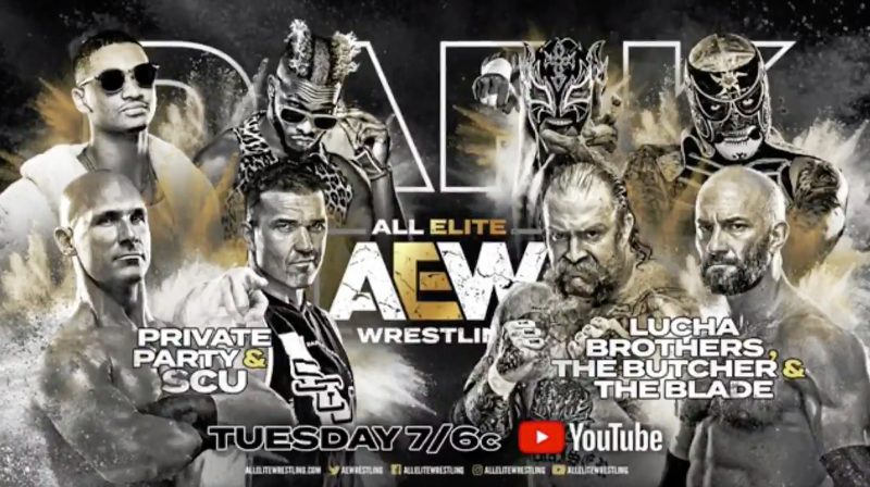 In that aforementioned eight-man tag for Tuesday, Private Party will team up with SCU (Kazarian and Daniels) against the Lucha Bros and The Butcher and The Blade. The latter will also be in eight-man action on Wednesday’s Dynamite against Jurassic Express and the Natural Nightmares.