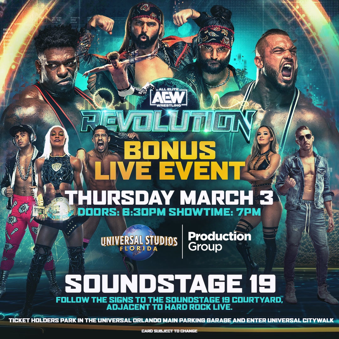 AEW will tape matches for Dark from Universal Studios in Orlando, Florida, on Thursday, March 3rd, with tickets on sale now. The Young Bucks, Wardlow, Will Hobbs, Jade Cargill, The Acclaimed, Orange Cassidy, and Anna Jay were all featured on promotional material for the event, seen above.