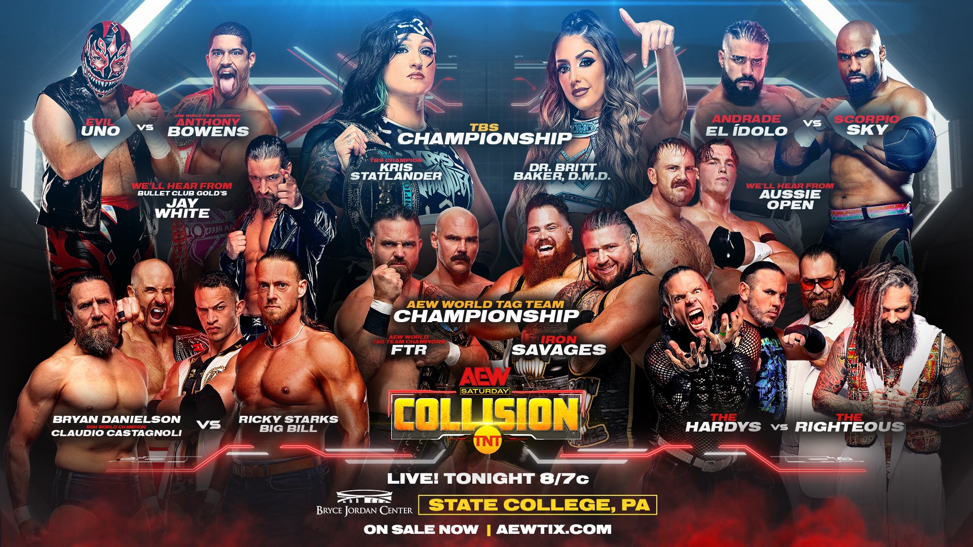 Two titles will be on the line as part of Saturday’s AEW Collision from State College, Pennsylvania.