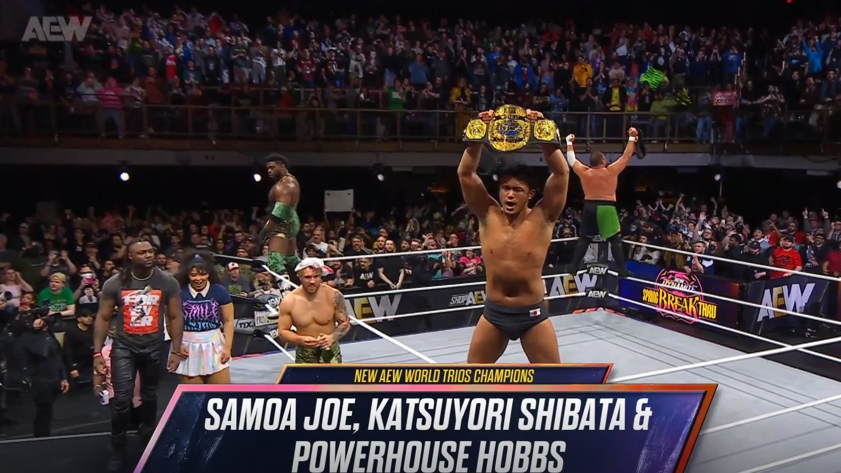 The Opps team consisting of Samoa Joe, Katsuyori Shibata, and Powerhouse Hobbs — substituting for Hook, defeated The Death Riders team of Jon Moxley — substituting for PAC, Claudio Castagnoli, and Wheeler Yuta in the main event of Wednesday’s Dynamite Spring BreakThru special in Boston, becoming the new World Trios Champions.