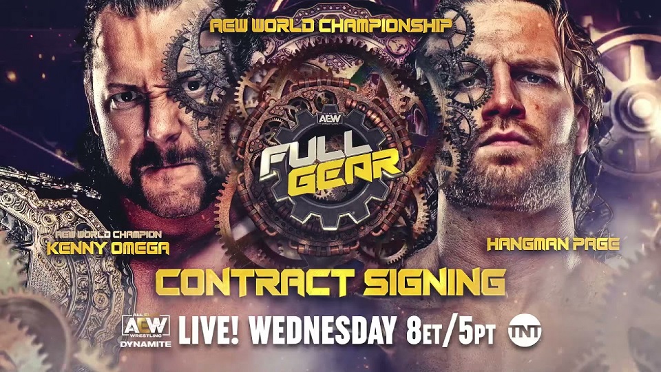 AEW World Champion Kenny Omega and top contender “Hangman” Adam Page will sign the contract for their Full Gear match on tonight’s Dynamite. Page won a casino ladder match on the October 6 Dynamite to earn the title shot.