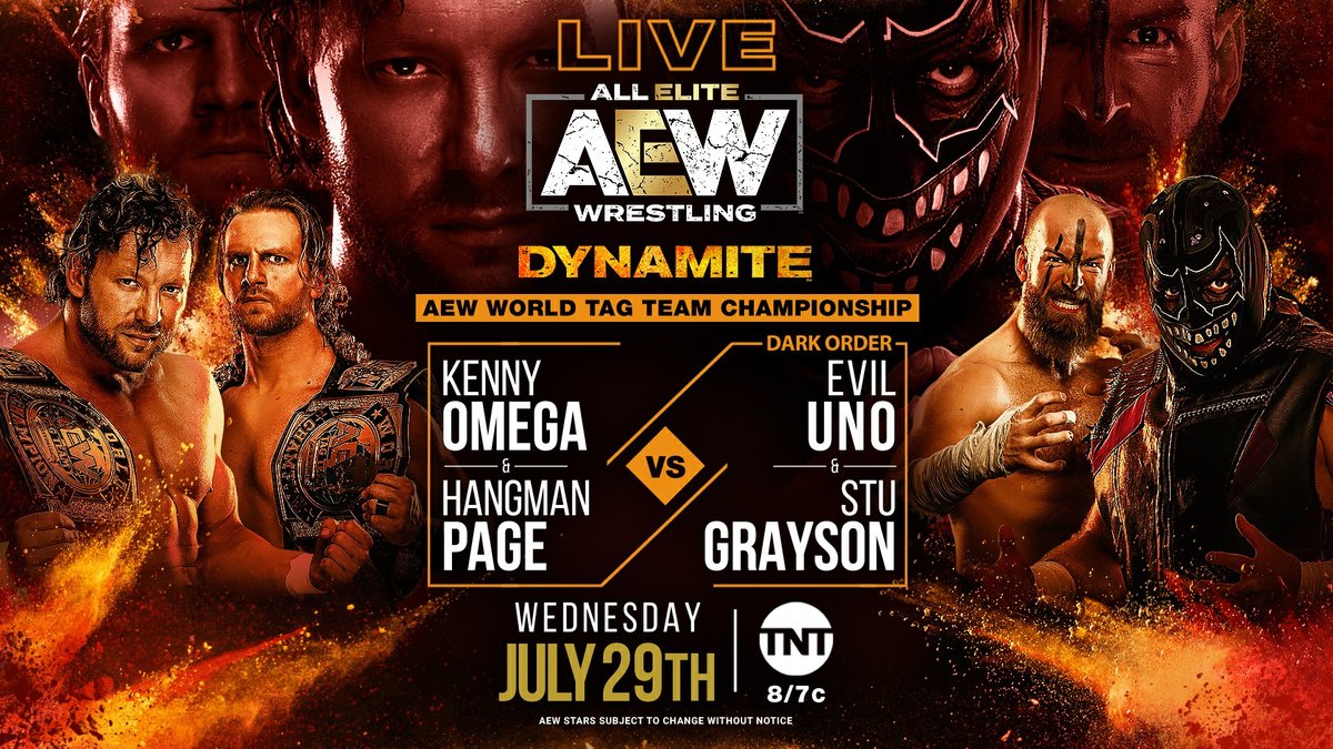 The AEW World Tag Team Championships will also be on the line tonight. Champions Kenny Omega and Hangman Page will defend against Evil Uno and Stu Grayson of The Dark Order. Omega and Page have made seven defenses of their titles since winning them from SCU on Dynamite in January.