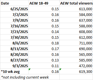 Listed below are the last 11 weeks of viewership numbers and 18-49 demo ratings for Dynamite, along with the 10-week average in both categories. This week’s episode was down 23.8 percent in viewers and 31.3 percent in 18-49 as compared to the recent averages.