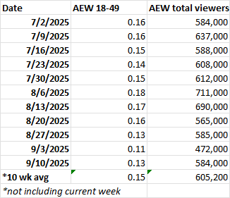 Listed below are the last 11 weeks of viewership totals and 18-49 demo ratings for Dynamite, as well as the 10-week average in both categories. This week’s show was down 3.5 percent in overall viewers and 13.3 percent in 18-49 as compared to the recent averages.