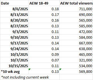 Listed below are the last 11 weeks of overall viewership and 18-49 demo ratings for AEW Dynamite on TBS and AEW Collision as well as the 10 week average in both categories for both shows. This week’s Dynamite was down 6.3% in total viewers and 15.4% in 18-49 as compared to recent averages while Collision was up 44.1% in total viewers and 83.3% in 18-49, which shows the benefit of following Dynamite on Wednesdays.