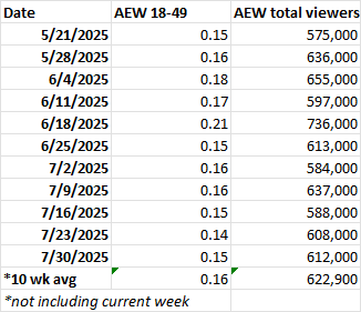 As compared to the same week in 2024, Dynamite’s overall viewership was up 0.5 percent while the 18-49 rating was down 16.7 percent. It’s the third time since April that the show has had a year-over-year increase in total viewership. This year’s numbers do not include viewers watching on the HBO Max simulcast.