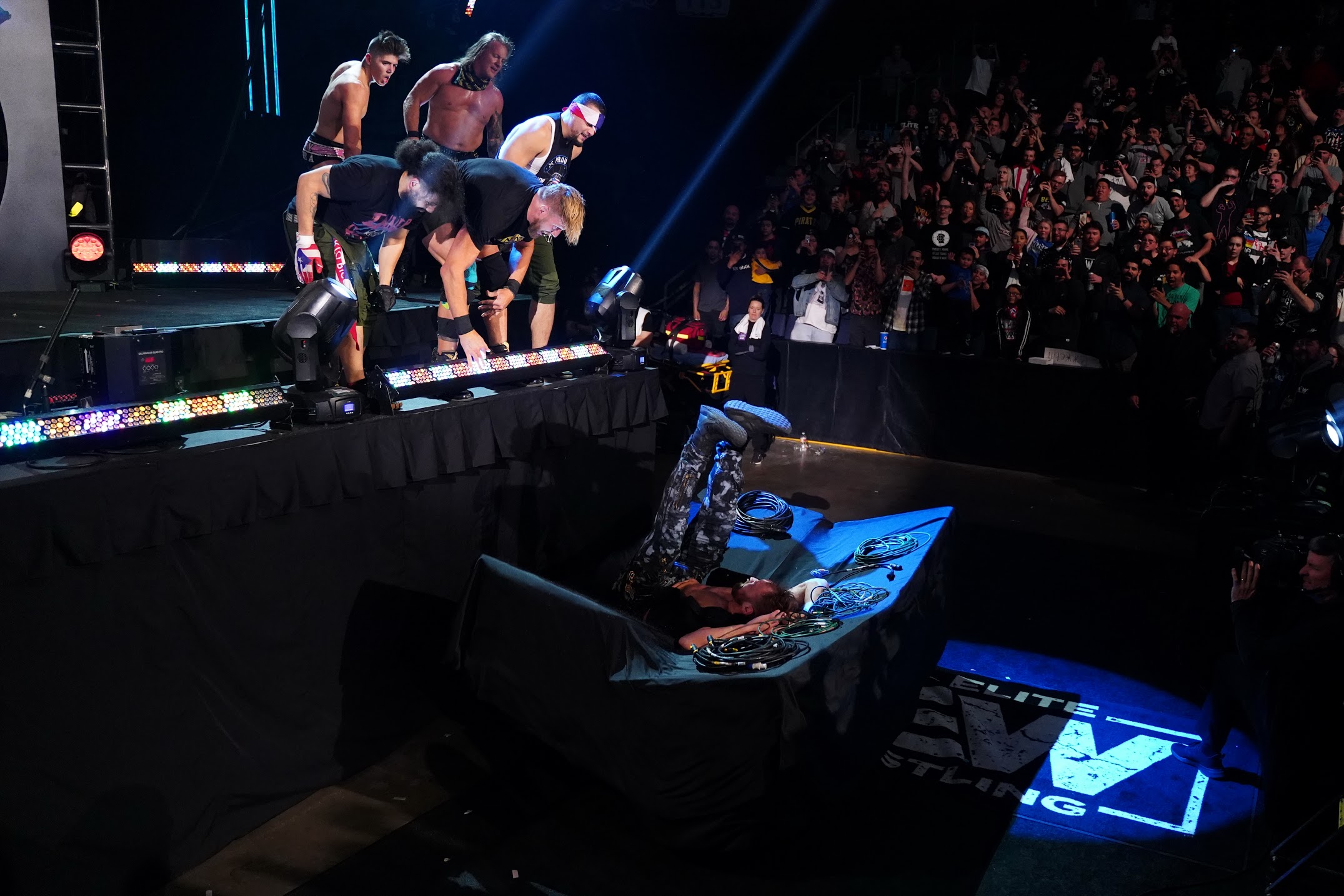 Jericho said if Moxley walked out of Dynamite after the Jericho/Sammy Guevara vs. Moxley/Darby Allin main event, he would leave AEW for 60 days. The Inner Circle jumped Moxley before the match and as the champion staggered to the ring after Allin was defeated in essentially a handicap match, the group attacked again and put him through a table off the stage.