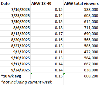 Listed below are the last 11 weeks of overall viewership and 18-49 demo ratings for AEW Dynamite on TBS as well as the 10 week average in both categories. This week’s show was up 4.9% in overall viewers, but down 6.7% in 18-49 as compared to recent averages.