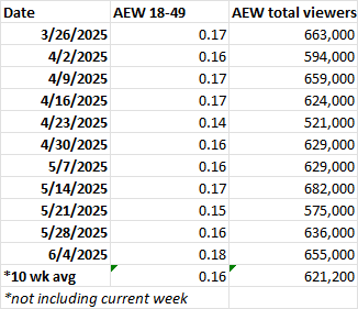 Listed below are the last 11 weeks of overall viewership and 18-49 demo ratings for both AEW Dynamite and AEW Collision as well as the 10-week average in both categories for both shows.