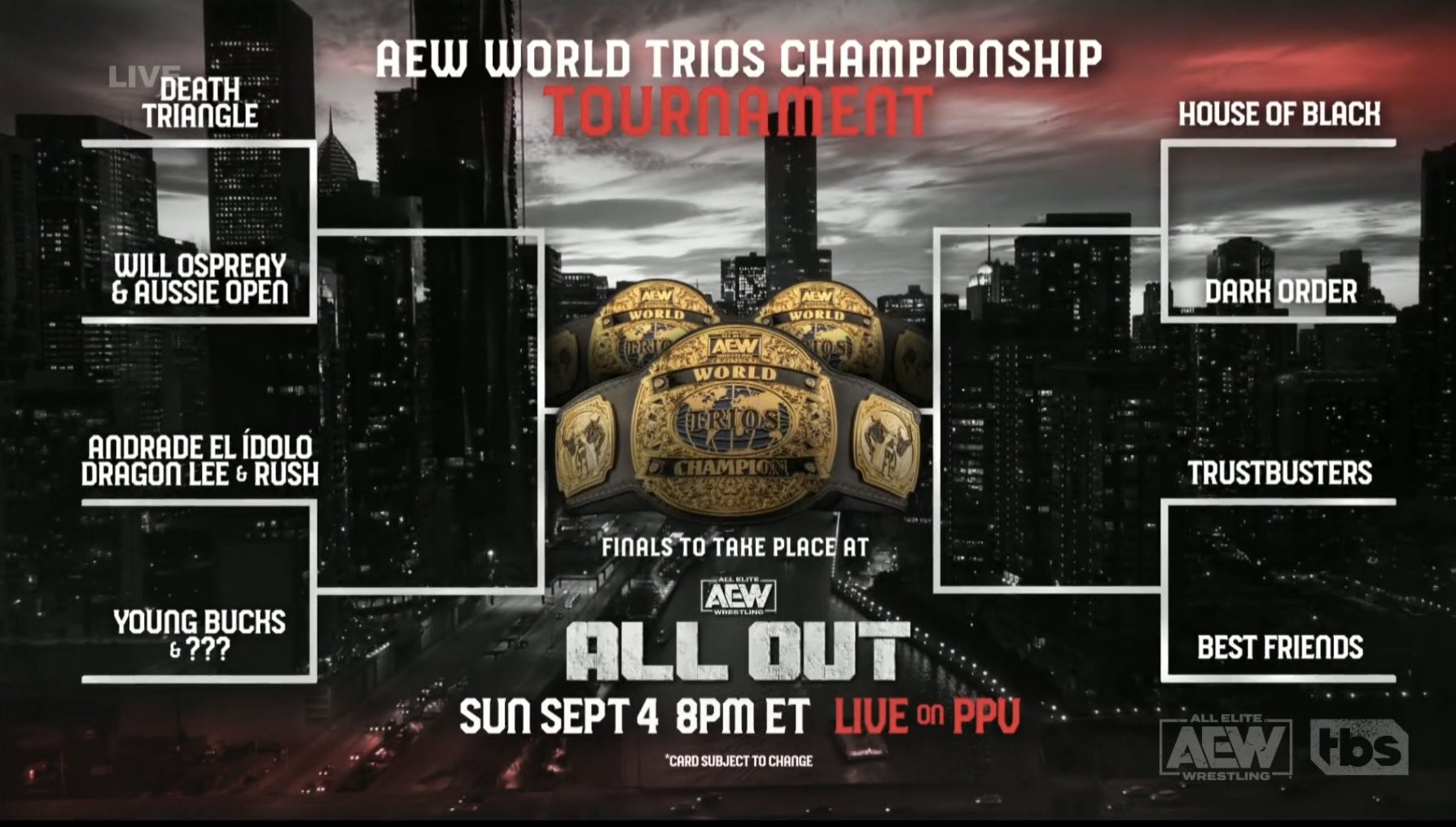 The tournament will begin next week, with Andrade El Idolo, Dragon Lee, and Rush set to take on The Young Bucks and a mystery partner on Dynamite. Later on Dynamite, Hangman Page rejected an offer by The Young Bucks to be their mystery partner, saying he had agreed to be in the corner of The Dark Order.