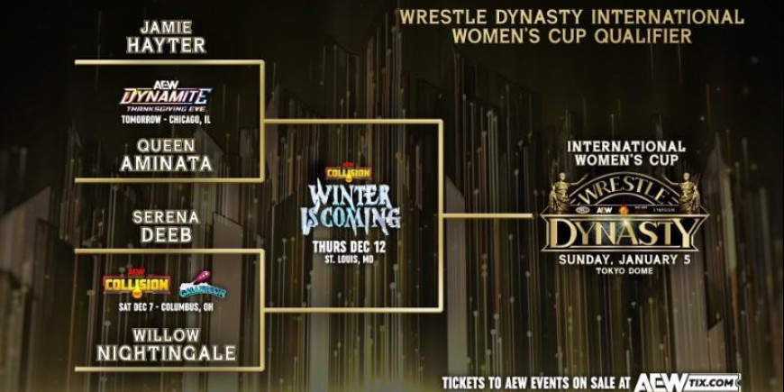 It was announced on social media that a mini-tournament will be held to determine AEW’s entrant in the four-way International Women’s Cup that will take place at Wrestle Dynasty on January 5 at the Tokyo Dome that will also feature Stardom, CMLL, and ROH talent. Jamie Hayter will meet Queen Aminata on Wednesday’s Dynamite, while Serena Deeb will take on Willow Nightingale on the December 7 edition of Collision. The winners of those two matches will face off at Collision Winter is Coming on December 12, where the winner will become AEW’s representative in the four-way.
