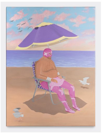 “Moriarty’s portraits reveal a different side of luchadors, known for their elaborate masks and larger-than-life personas typically seen in the ring,” the press release reads. “Here, they’re shown in quiet, everyday moments: one lounges in a beach chair beneath the sun; another builds a snowman on a quiet winter afternoon; a third peers through binoculars, birdwatching in a peaceful clearing.”