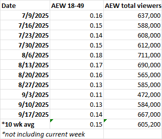 The first two hours of Wednesday’s AEW September to Remember episode of Dynamite averaged 667,000 viewers on TBS, up 14.2% from the previous week — the largest audience for the show since August 13.