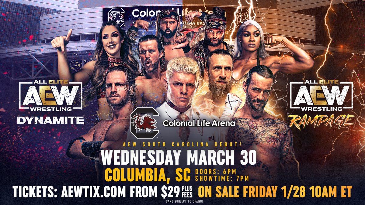 It was announced today that AEW will make its South Carolina debut with a live Dynamite episode and Rampage tapings taking place on Wednesday, March 30. The show will be held at the Colonial Life Arena in Columbia, South Carolina.