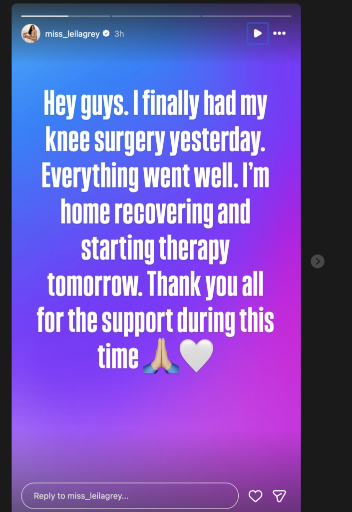 “Hey guys. I finally had my knee surgery yesterday. Everything went well. I’m home recovering and starting therapy tomorrow. Thank you all for the support during this time.”