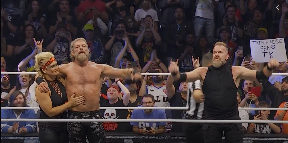 After Adam picked up the win with a spear and pin on Cash Wheeler, Beth came back out to celebrate with her husband and Cage when Nick Wayne, Mother Wayne and Kip Sabian appeared and distracted them. FTR attacked Cage and Adam from behind, handcuffing him from behind.