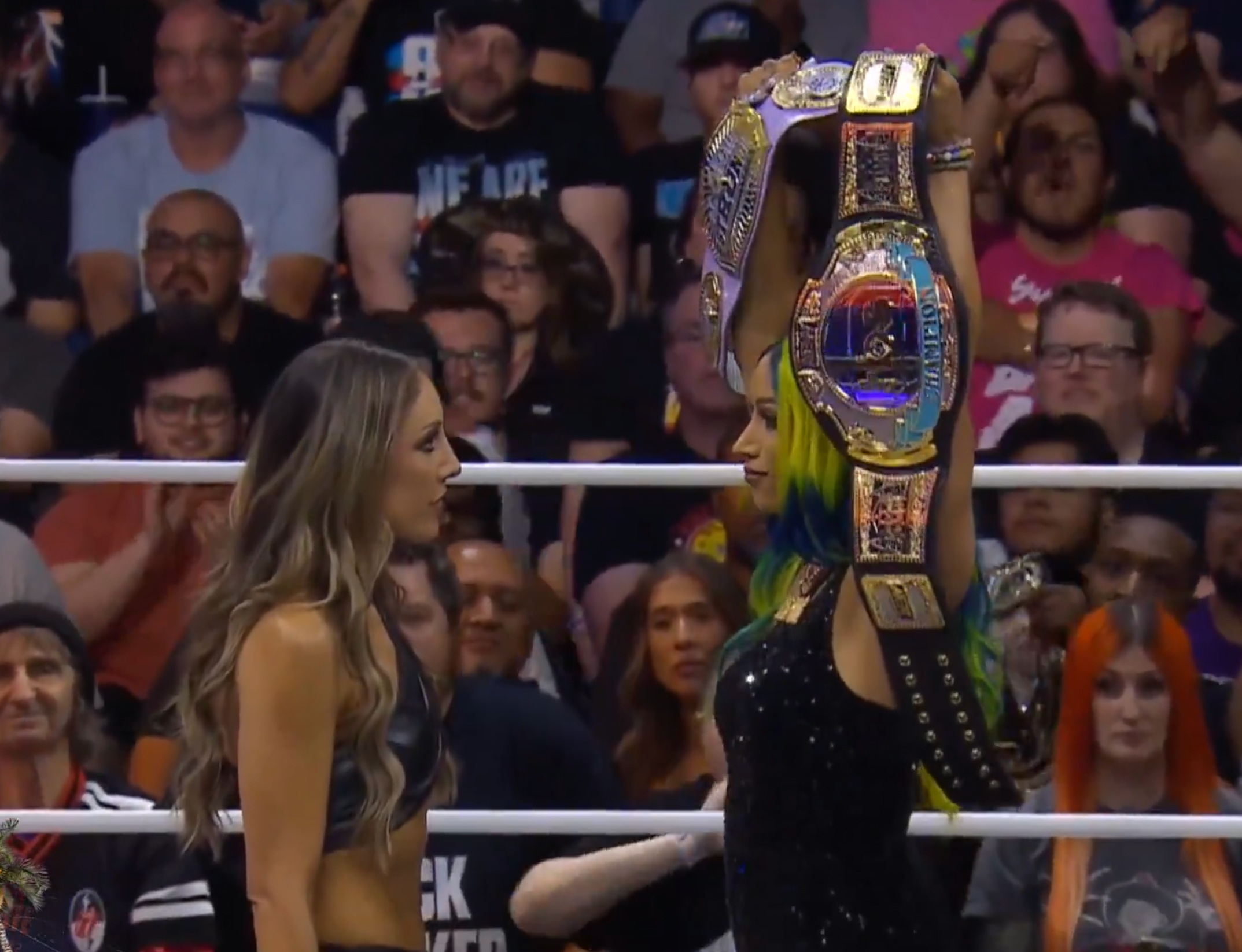 The two then sparred verbally for several minutes with Mone moving into full heel mode. Baker then challenged Mone for All In from Wembley Stadium in London, but Mone said there was a line to get in as there were more deserving women in the back. The two didn’t get physical, but went face-to-face several times with Mone holding up the two title belts before leaving the ring.