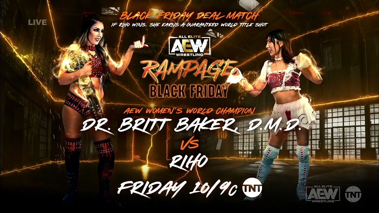 In a Black Friday Deal match, AEW Women’s World Champion Britt Baker will face former Champion Riho in a non-title match. Should Riho win, she will receive a future shot at Baker’s World title.