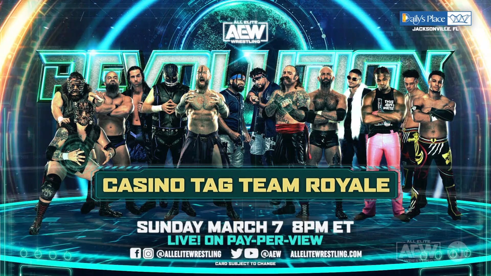 A Casino Tag Team Royale for a future Tag Team title shot will take place with seven teams announced. Bear County, Alex Reynolds and John Silver, Evil Uno and Stu Grayson, Ortiz & Santana, The Butcher and The Blade, Private Party and Top Flight were shown as participants during the announcement with more teams expected to be announced prior to Revolution.