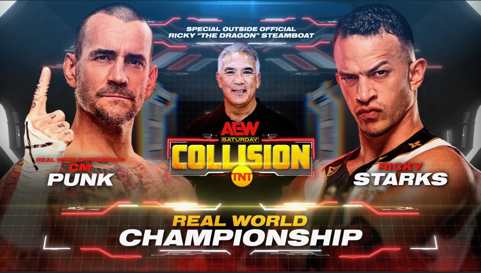 Punk will defend the title against Ricky Starks, who has pinned Punk by using the ropes for the last two weeks in a row. The match was set up on Saturday’s Collision after Starks agreed to a match with a special outside enforcer. Tony Schiavone at the end of the segment announced that Ricky “The Dragon” Steamboat would be the outside enforcer for the match.