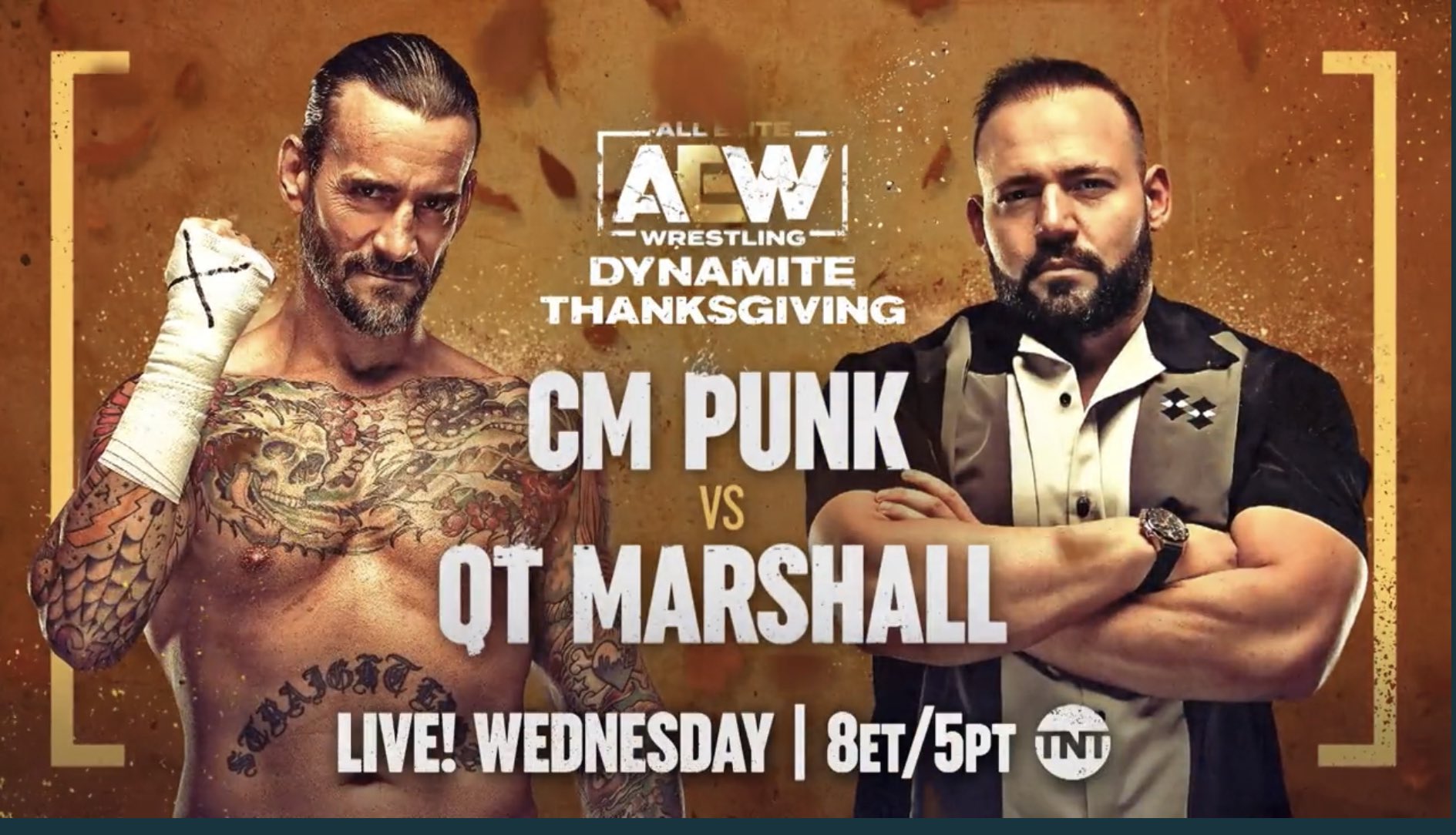 CM Punk will wrestle in his hometown this Wednesday as he takes on QT Marshall on the Thanksgiving eve edition of AEW Dynamite from Chicago, Illinois.