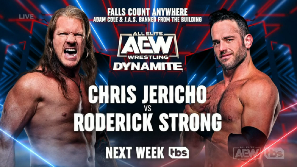 Following up on a backstage promo battle between the two on this week’s show, Chris Jericho will take on Roderick Strong in a falls count anywhere match next week. In addition, Jericho’s Jericho Appreciation Society, and Strong’s ally Adam Cole will be banned from the building.