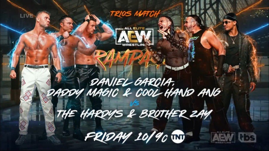 As announced during Dynamite Title Tuesday, Matt Hardy, Jeff Hardy, & Brother Zay will face Matt Menard, Angelo Parker, & Daniel Garcia on Friday’s show in six-man tag team action.