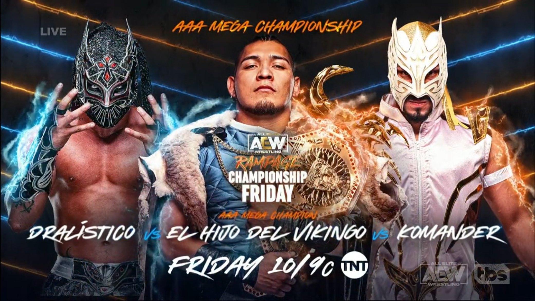 In the featured bout, AAA Mega Champion El Hijo del Vikingo will put his title on the line against Dralistico and Komander in a three-way. Vikingo has held the gold for more than 540 days and this will be his fifth appearance on AEW TV.