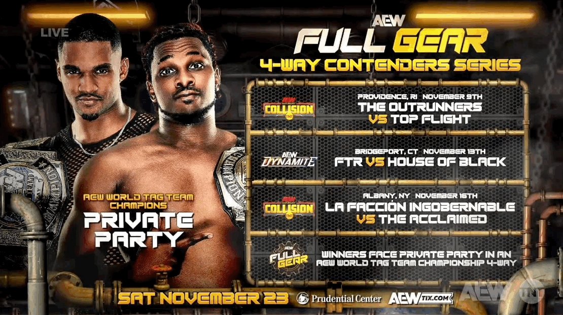 It was announced on this week’s Collision that Private Party will be defending the Tag Team titles at Full Gear in a four-way match. Contenders will be determined via a Full Gear 4-Way Contenders Series that will begin on next Saturday’s Collision. The series will include the following matches: