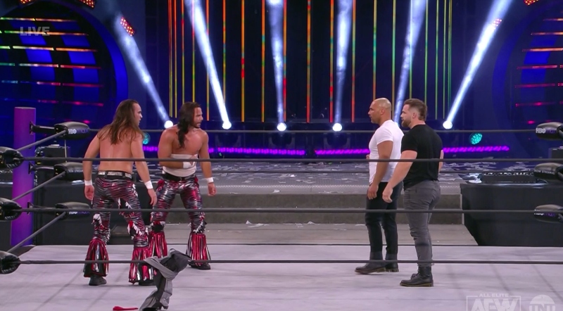 As they fought, a black pickup truck was shown pulilng up to Daily’s Place and Dax Harwood and Cash Wheeler jumped out. They walked into the ring and instead of attacking the Bucks, they went after Butcher and Blade. After brawling, they hit a spike piledriver on Blade and the Shatter Machine on Butcher to clear them out before turning down a handshake from the Bucks and walking out.