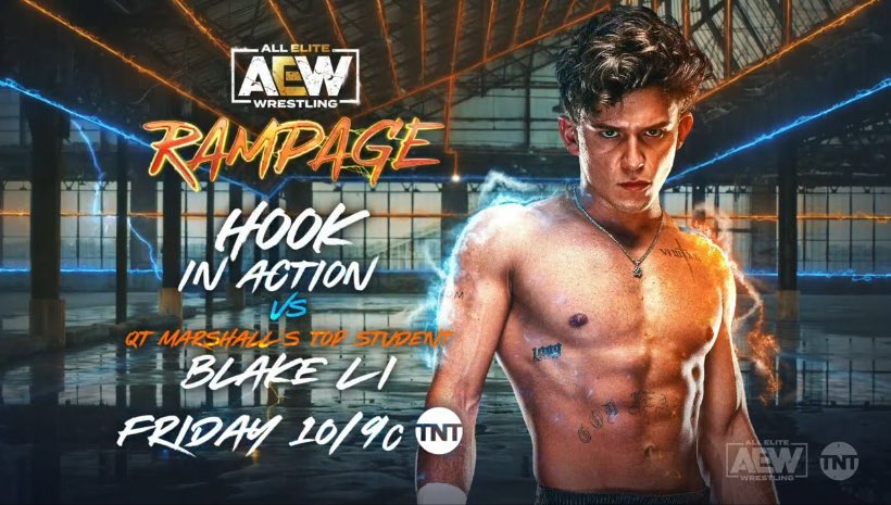 Hook will be n action on the show, facing Blake Li. The match was set up in a promo by QT Marshall on this week’s Rampage. Marshall stated that was going to send his top student from The Factory to take on Hook.