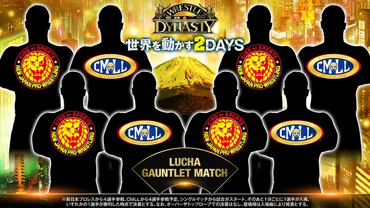“Also set for Wrestle Dynasty is a special NJPW vs CMLL lucha gauntlet match. In this matchup, up to eight participants, four from New Japan and four from CMLL, will enter the ring at one minute intervals, and the first pinfall will end the bout. Who will be in this dramatic and high speed encounter?”
