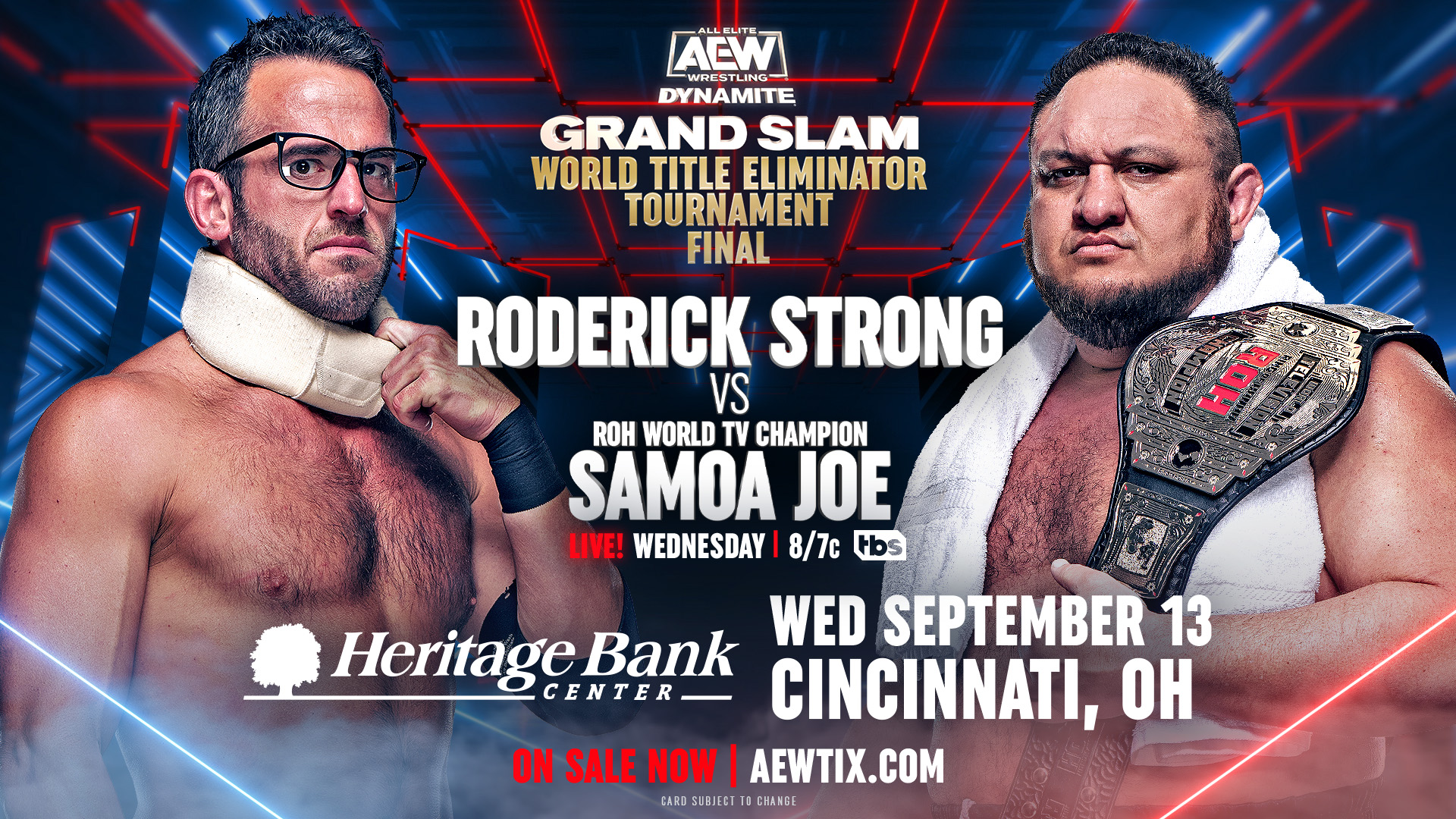Samoa Joe and Roderick Strong square off in the AEW Grand Slam World title eliminator tournament finals on tonight’s Dynamite from Cincinnatti, Ohio.