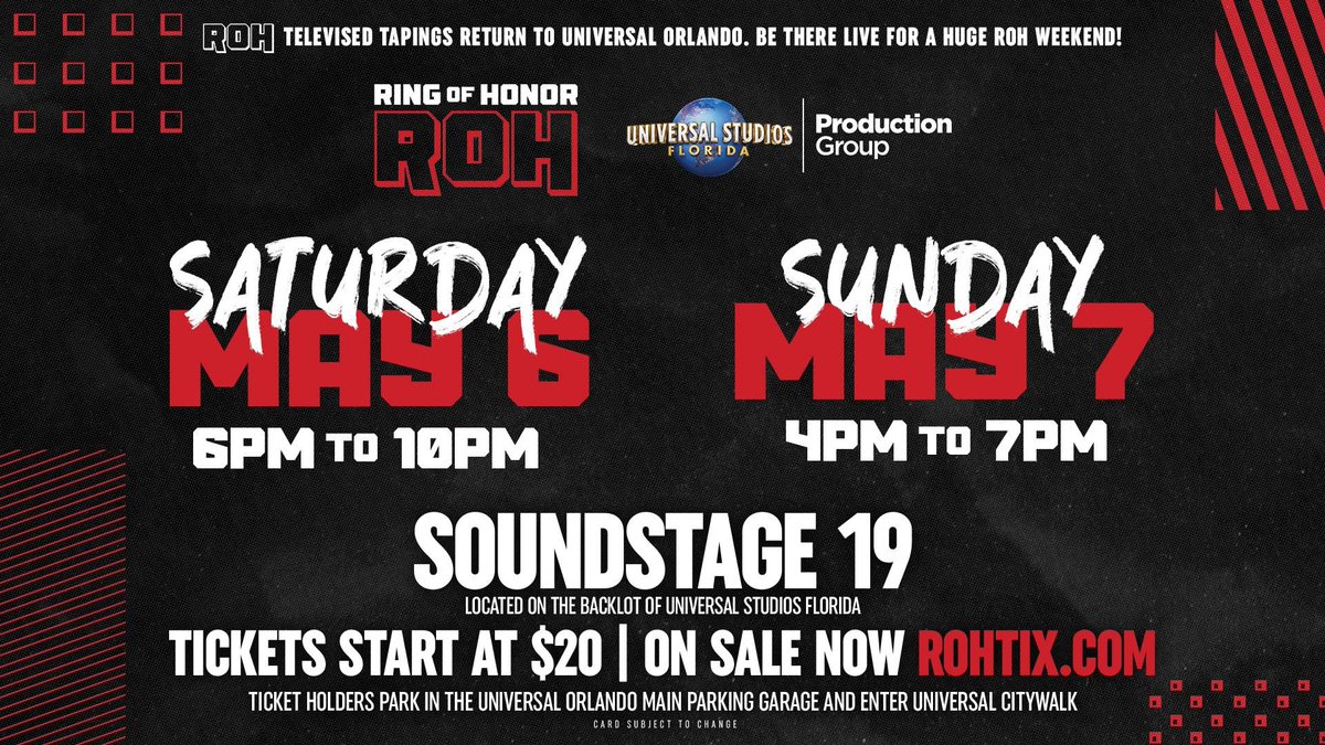 It was announced today that ROH will hold TV tapings at Universal Studios in Orlando, Florida on Saturday, May 6 and Sunday, May 7. The Saturday tapings will take place from 6-10 p.m. Eastern time. The Sunday show is set to begin at 4 p.m. Eastern and end at 7 p.m. Eastern.