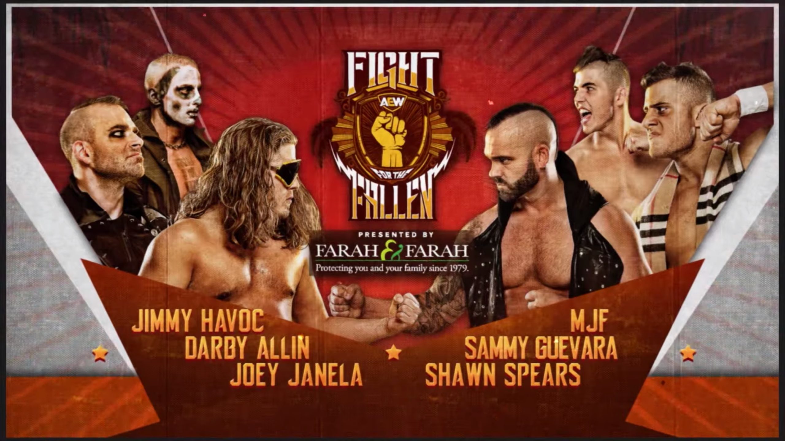 On this week’s Road to Fight for the Fallen episode, it was announced that Jimmy Havoc, Darby Allin & Joey Janela will team against MJF, Sammy Guevara & Shawn Spears at the show. It’s taking place at Daily’s Place Amphitheater in Jacksonville, Florida on Saturday, July 13.