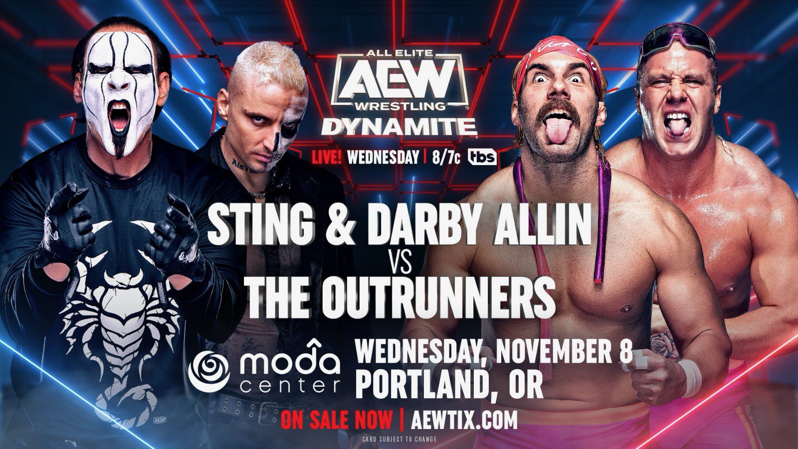 TBS, 8pm ET/7pm CT@Sting + @DarbyAllin vs. OutrunnersIn his first match in Oregon since 1989 and likely his last ever Oregon match, Sting will team up with Darby to fight The Youngest Men Alive in Portland this WEDNESDAY! pic.twitter.com/agDjbpx8vu