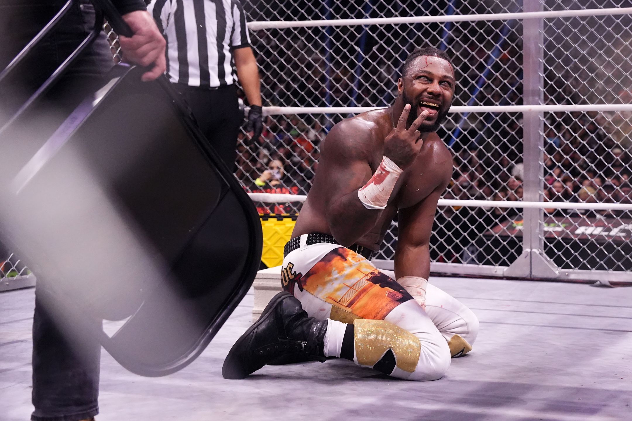 Hangman Page stuck Strickland in the mouth with a hypodermic needle and delivered a chair shot to his head in the closing moments of their cage match on Saturday. The angle was done to write him off AEW programming.