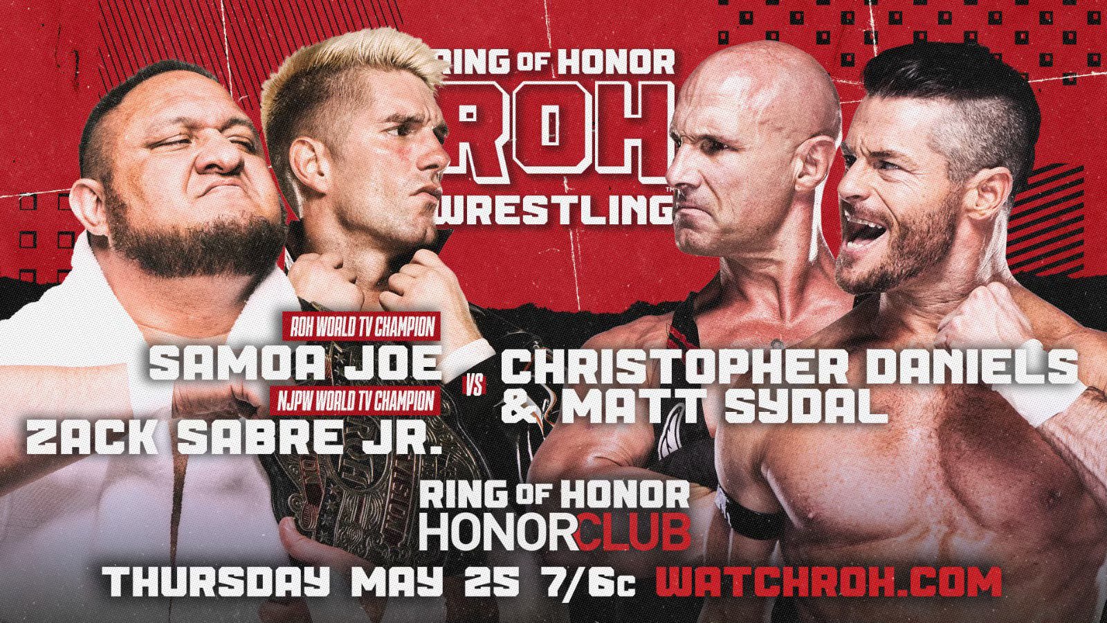 As announced by Tony Khan on Twitter, ROH Television Champion Samoa Joe and NJPW World Television Champion Zack Sabre Jr. will face Christopher Daniels and Matt Sydal on next week’s Ring of Honor TV.