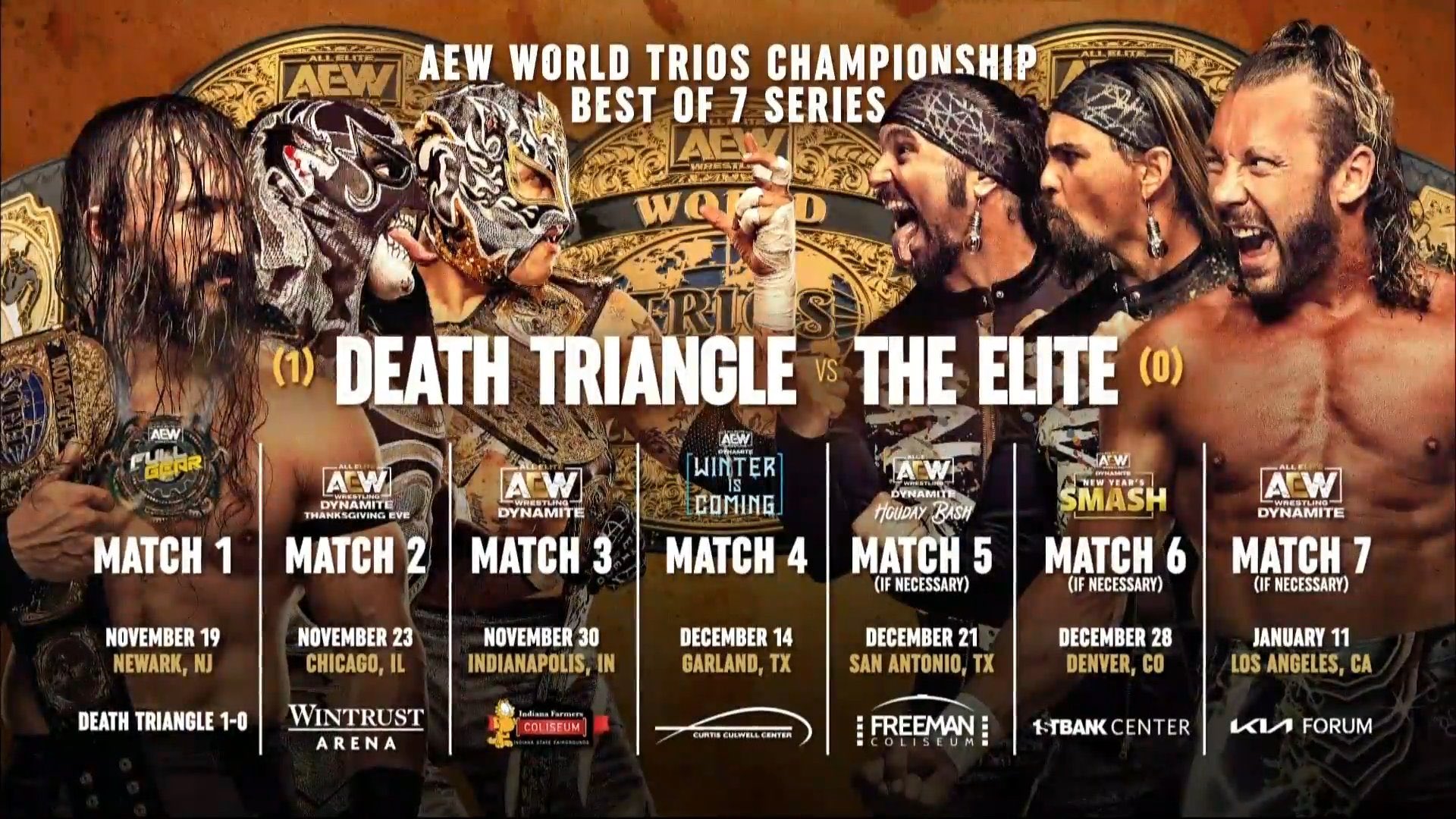 It was revealed during Saturday’s Full Gear pay-per-view that the Death Triangle vs. The Elite match at Full Gear was the first in a best-of-seven series for the AEW World Trios Championship, with the next bout set for Wednesday’s Dynamite.