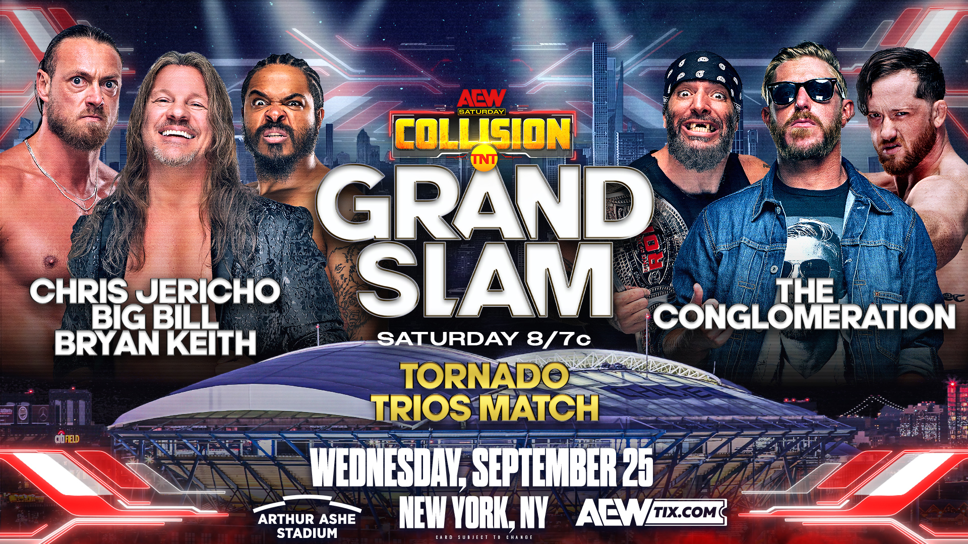 Two matches were confirmed for Collision Grand Slam, which will air next Saturday. Chris Jericho, Big Bill, and Bryan Keith will take on The Conglomeration’s Mark Briscoe, Kyle O’Reilly, and Orange Cassidy in a tornado trios match. Since losing at All In, Jericho has honed in on Cassidy and the rest of the Conglomeration. After losing to Cassidy on Dynamite, Jericho and the Learning Tree responded by attacking The Conglomeration on Rampage.