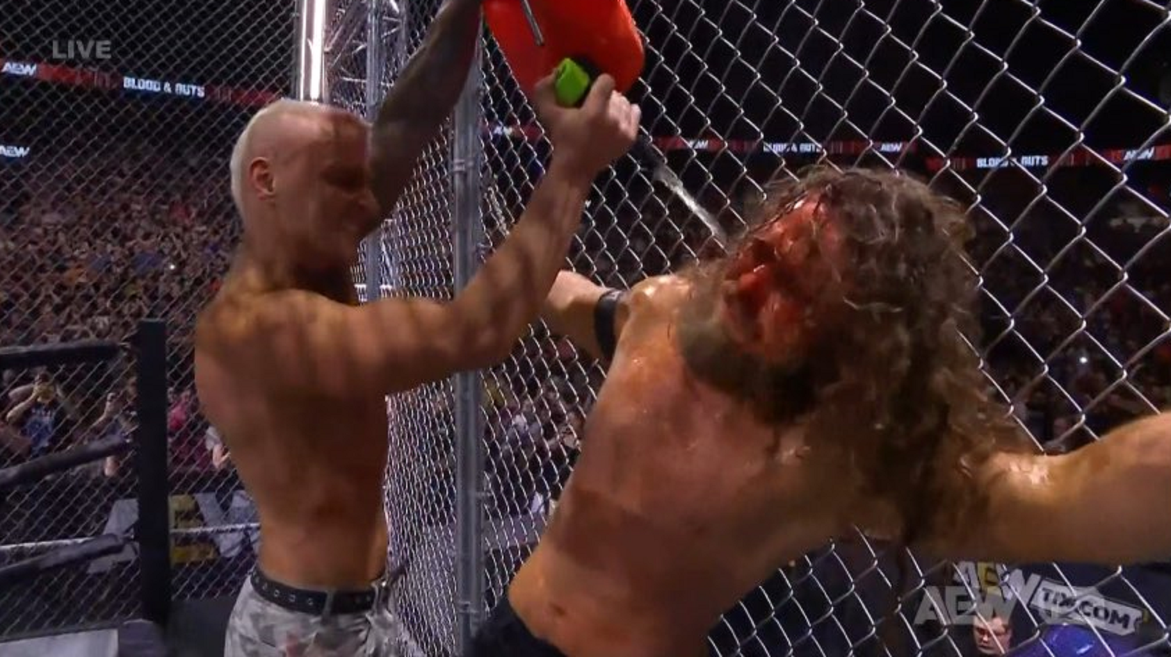 Allin handcuffed Perry to the cage wall during the Team AEW vs. Team Elite Blood & Guts match on Wednesday’s episode, then doused the champion with gasoline.