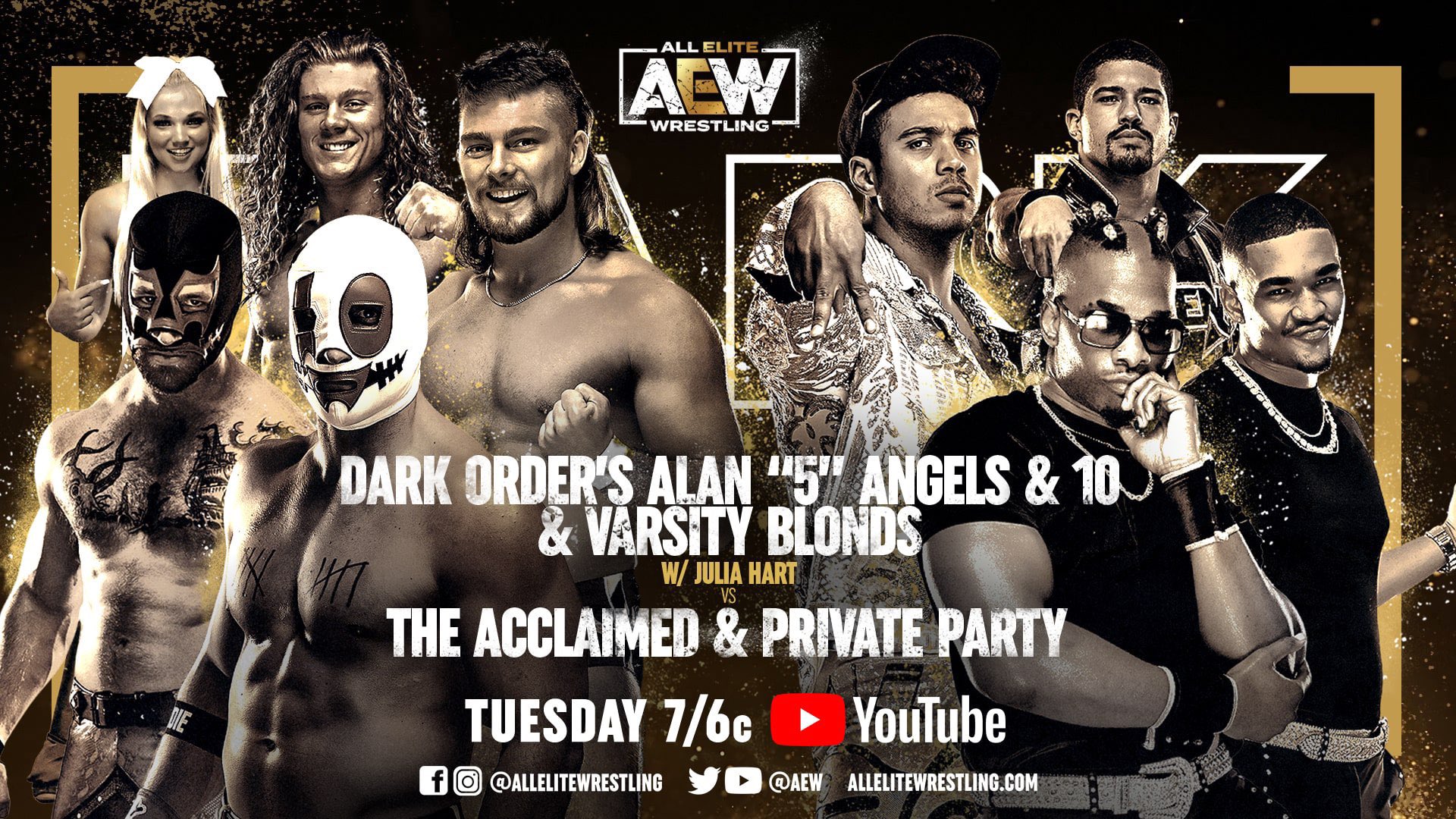 Top contenders The Varsity Blonds will team with Alan “5” Angels and 10 of the Dark Order to take on The Acclaimed and Private Party. The Dark Order and the Hardy Family Office have been feuding in recent weeks while The Acclaimed wants a match against the Blonds in order to take their no. 1 contenders’ spot.